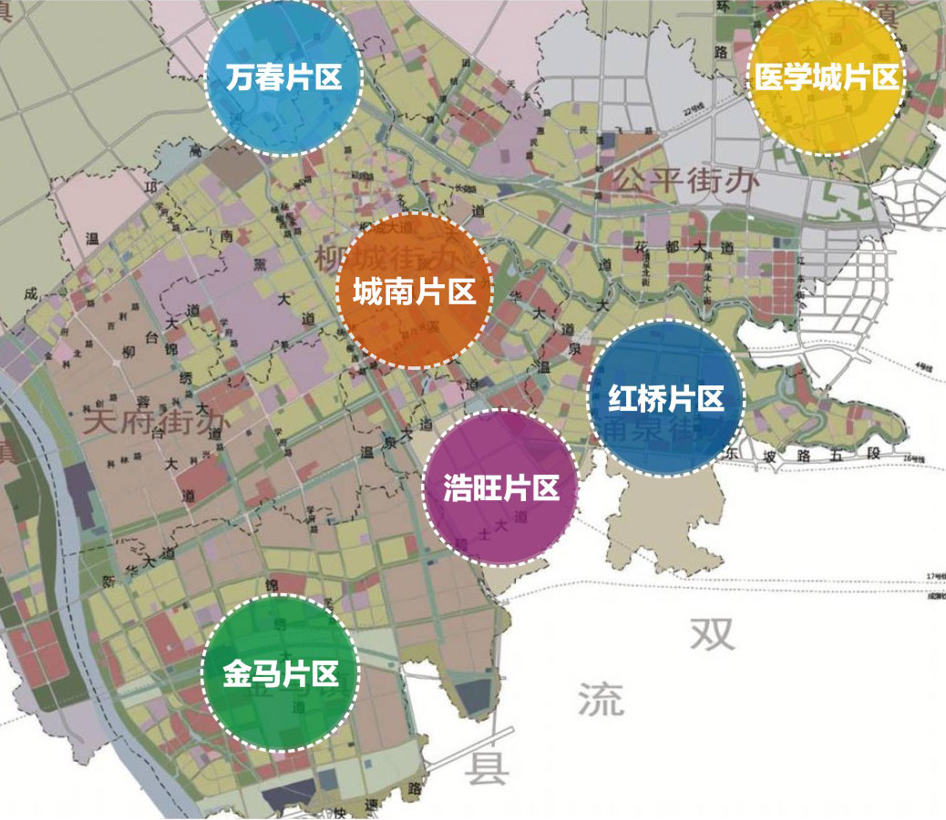 该区域位于成温邛以南,江安河以北,东接青羊,西邻温江中学,花都大道穿行而过,周边房产项目众多,人口聚集。现有存量土地资源约1680亩。城市规划为商住用地。