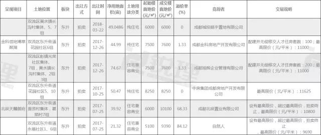 锐理数据显示,2017年至今,双流东升板块共有6宗土地通过招拍挂市场成交,其中2宗土地有人才住房建设要求,5宗土地有最高限价要求。最高楼面地价为10100元/㎡,溢价率最高为84.12%。本宗土地配建要求相对来说并不复杂,是其优势。