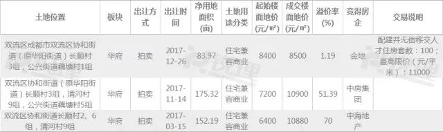 锐理数据显示,2017年至今,双流华府板块仅有三宗土地成交,最高成交楼面地价为10900元/㎡。溢价率最高51.39%。