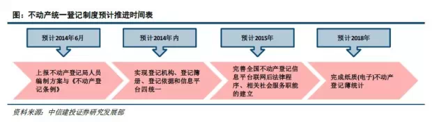 不动产登记制度和房地产税立法进展?不动产统一登记制度的建立步骤已经基本明确:在2014年6月上报不动产登记局人员和《不动产登记条例》、年内完成登记机构、登记簿册、登记依据和信息平台四统一、2015年左右完善全国信息联网程序、2018年左右完成纸质(电子)不动产登记薄。其中最后一个步骤是《不动产登记条例》的核心,由于整体登记工作量巨大,预计在2018年前难以完成。而关于房地产税立法,据中信建投证券了解,房地产税法尚处于推进阶段,相关草案最快在2016年或者2017年才能进入人大立法程序。
