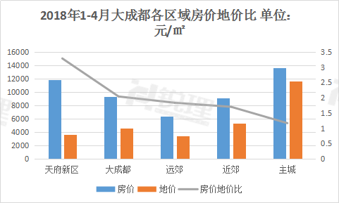 (2018年1-4月大成都各区域房价地价比 来源:锐理数据)