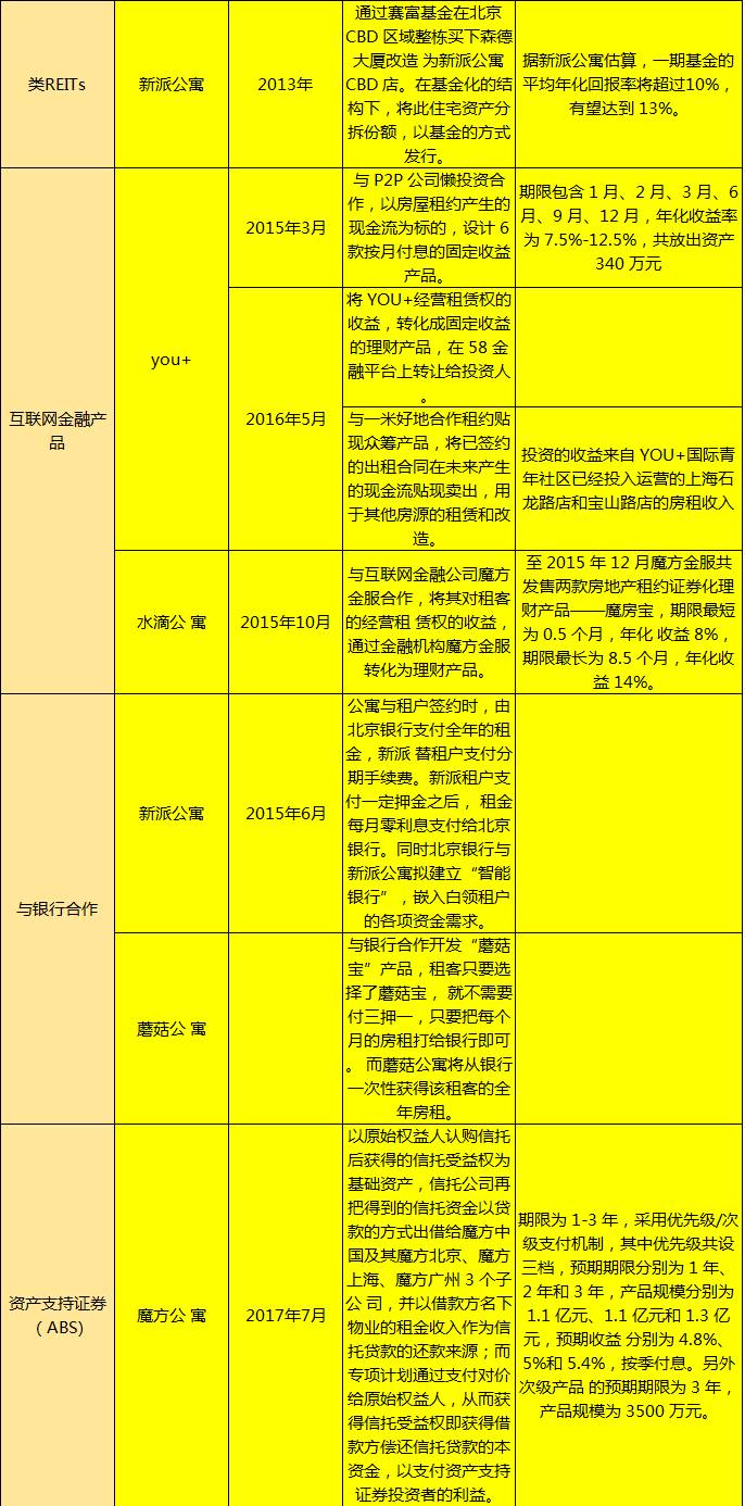 实际上,在国内,各类租赁领域类REITs也已经展开,新派公寓在北京CBD区域的森德大厦打造旗舰店,将该店资产分拆为基金发行,预期年化回报率10%~13%。其他的如ABS类金融产品也在进行积极地探索。